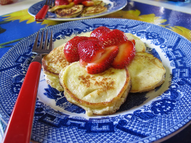 One of my personal favorites from the Dark Shadows Celebrity Cookbook is this one for Cheese Pancakes and I highly recommend them. They come courtesy of actor Jack Guilford by way of Diana Millay and are quite marvelous. They are simple to prepare with little or no clean-up. These little pancakes turn out so light they nearly float off the plate. Moist and tender, they have an intriguingly subtle cheese flavor which is altogether heavenly! They cook in seconds, so you have to watch them carefully as the recipe advises. You should choose ricotta cheese as a close relative of pot cheese. Actual pot cheese is now difficult to find in supermarkets and resembles ricotta or farmer cheese. The batter also includes matzo meal and sour cream making the pancakes airy, fluffy, and slightly tangy. Served with strawberries and extra sour cream what could be better? These pancakes would be delicious with any choice of fresh or frozen berries, honey, syrup, or jam. I had them for a light lunch, but they would be great for a leisurely weekend breakfast or brunch with a steaming pot of coffee. You could even imagine you're dining alfresco on the Collinwood terrace in the summertime.
